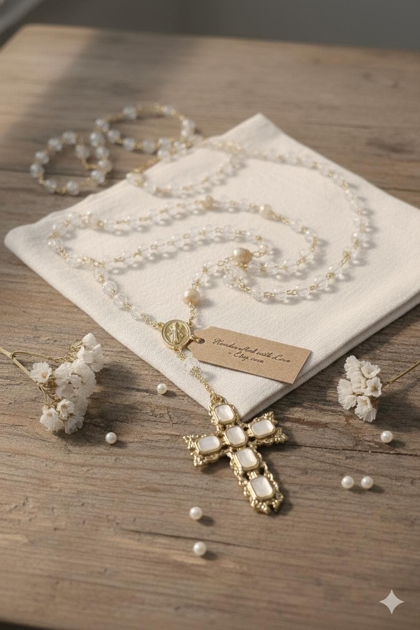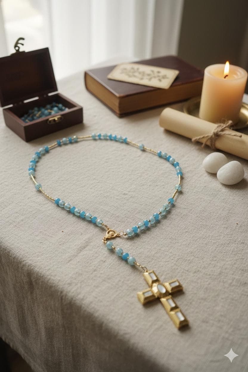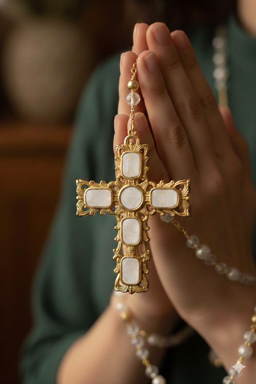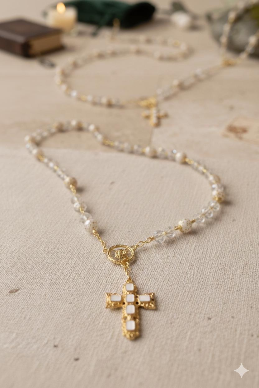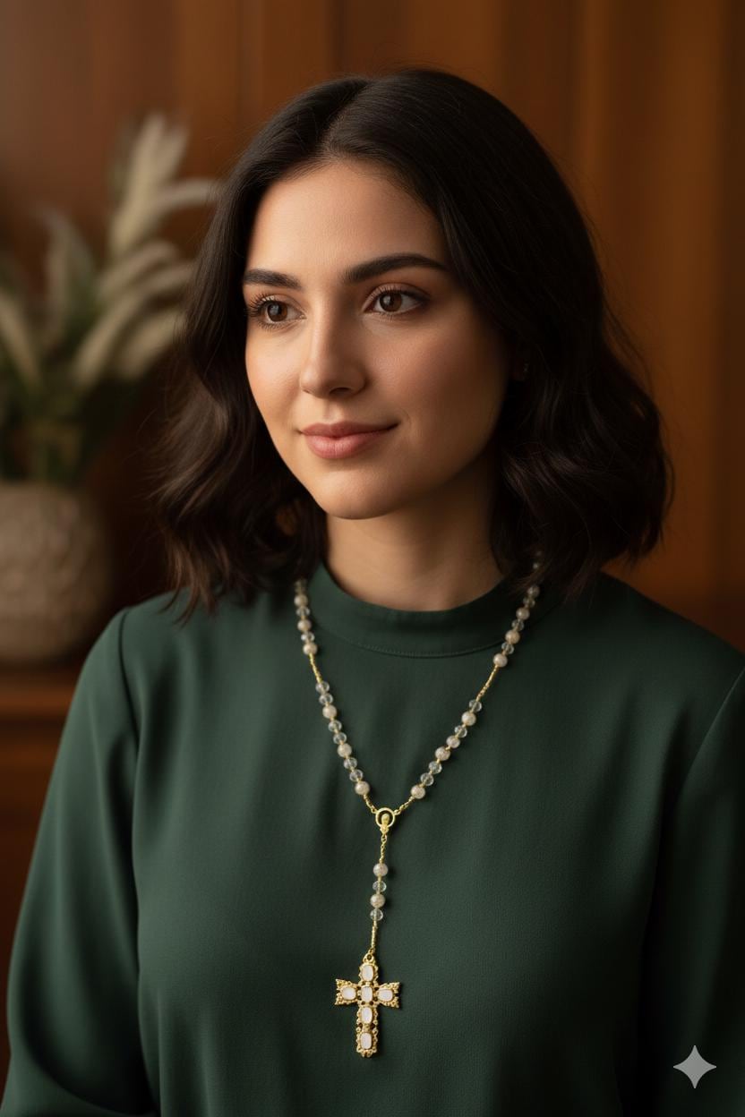The golden cross, embellished with light inserts, gives brightness and refinement, making this rosary ideal both for prayer and as a symbolic jewel or valuable gift.