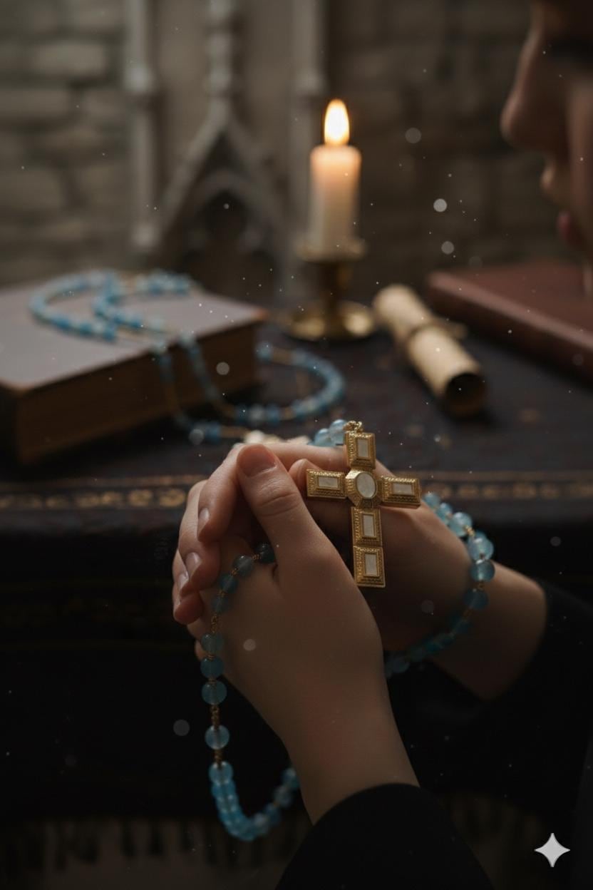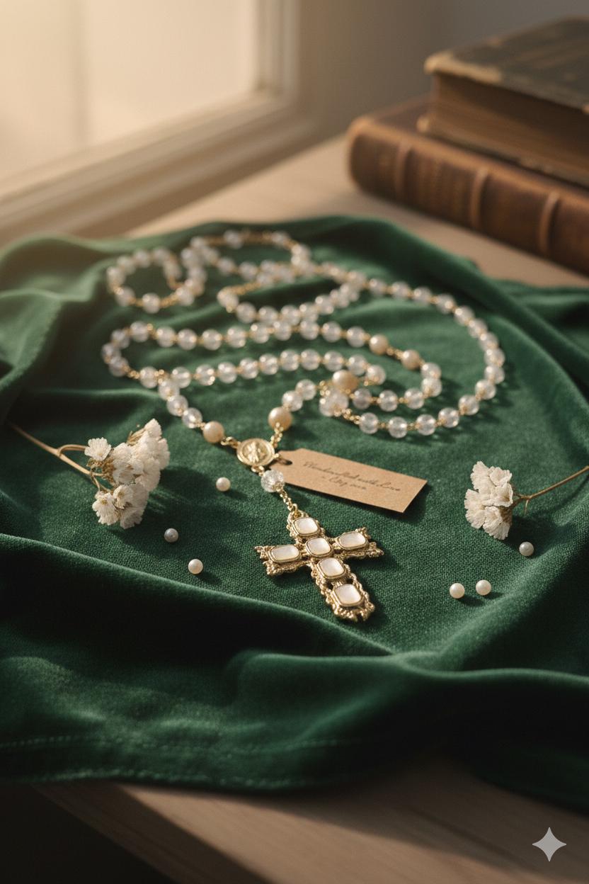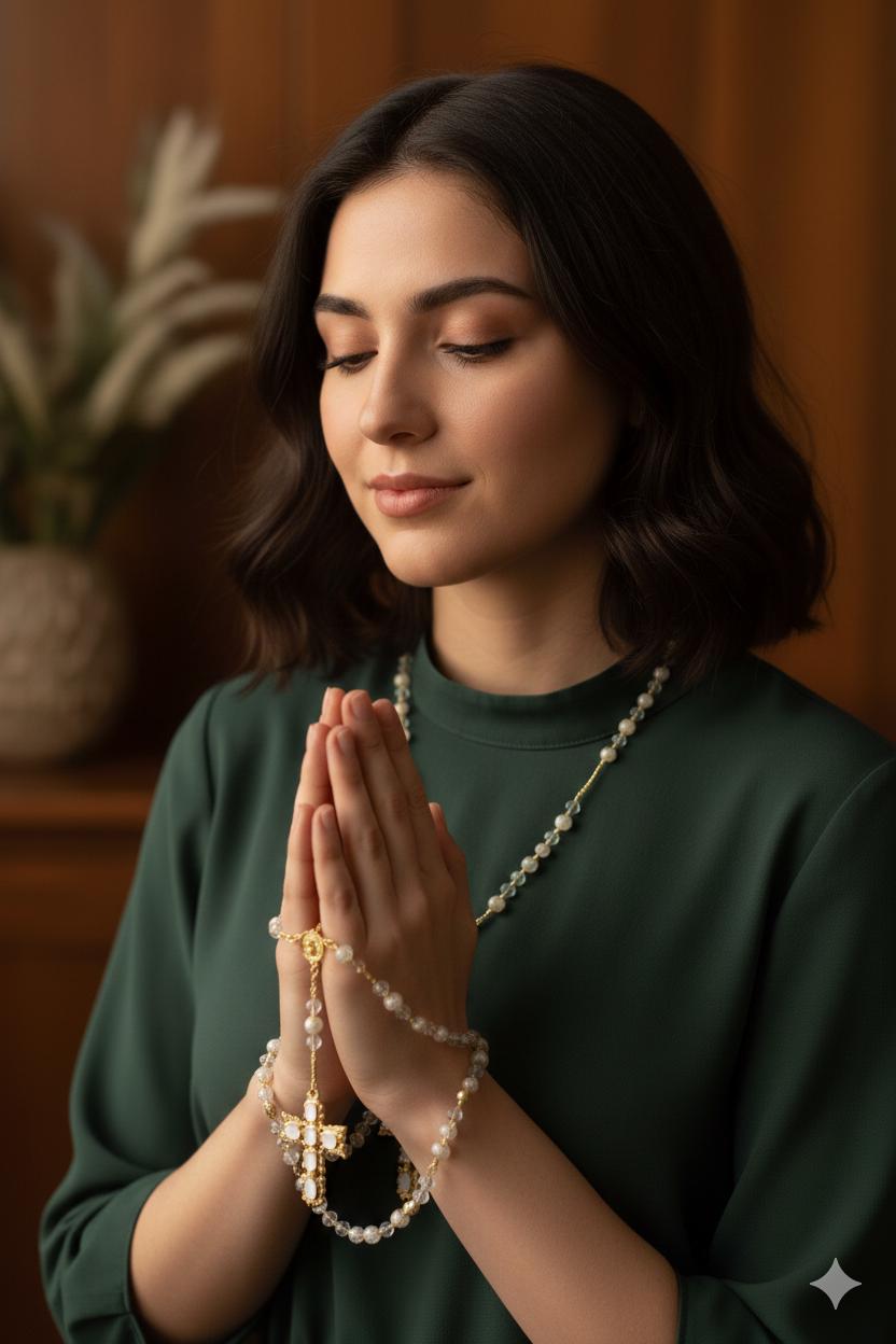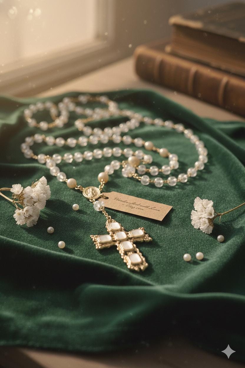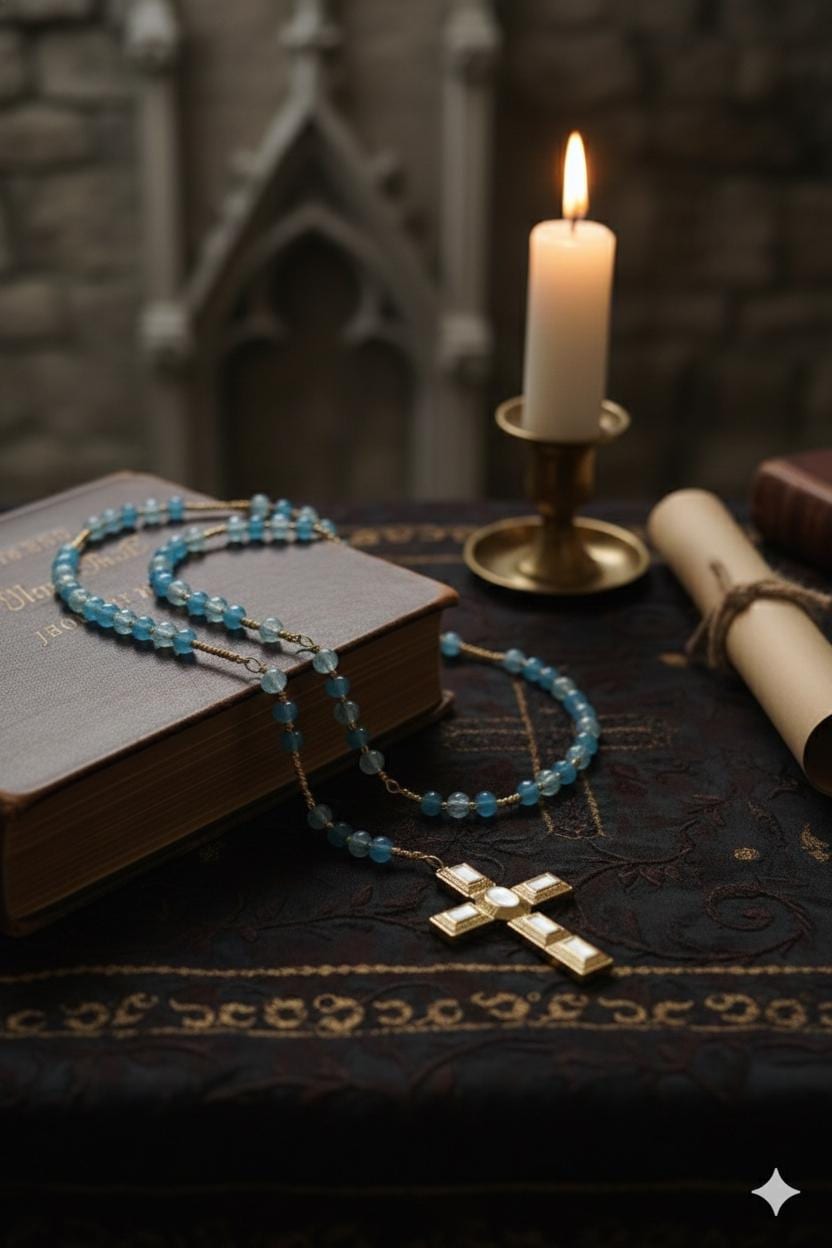 The golden cross, embellished with light inserts, gives brightness and refinement, making this rosary ideal both for prayer and as a symbolic jewel or valuable gift.